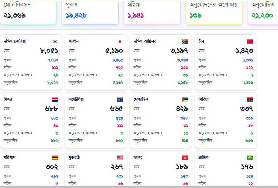 এর মধ্যে সবচেয়ে বেশি নিবন্ধন করেছেন দক্ষিণ কোরিয়ার প্রবাসীরা। সেখান থেকে ৮০৫০ জন নিবন্ধিত হয়েছেন যার মধ্যে ৬১১ জন মহিলা রয়েছেন।